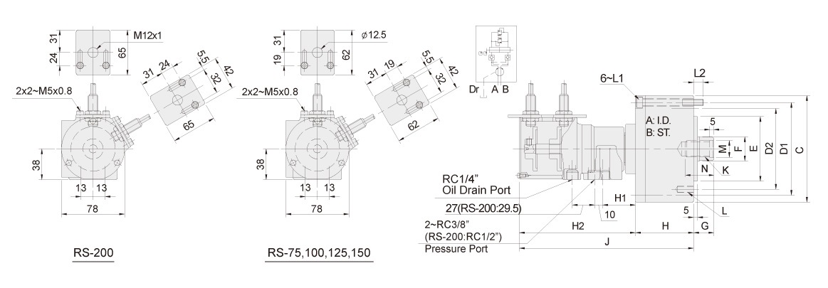 | RS-200 | 200 | 35 | 245 | 220 | 145 | 120 | 55 | 70 | 35 | 115 | 34 | 142.5 | 257.5 | M36x4.0 | 12~M16x30 | M10x125 | 21 | 38 | 60 |