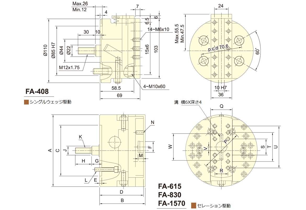 | * FA-610 | 156 | 110 | 140 | 107 | 5 | 20 | 66 | 48 | ±5 | 20 | M12x1.75 | 4-M10x90 | 12 | 2-M10x45 | 104.8 | 28 | 8 | 4-M10x16 | 40 | 40 |