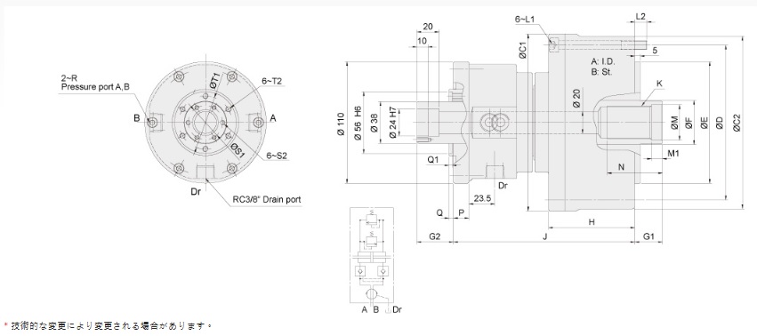 | 品番 | A | B | C1 | C2 | D | E(h7) | F | G1max. | G1min. | G2max. | G2min. | H | J | K | L1 | L2 | M H8 | M1 | N | P | Q | Q1 | R | S1 | S2 | T1 | T2 |