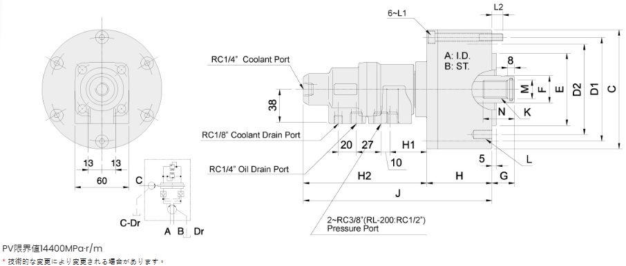 | 品番 | A | B | C | D1 | D2 | E (h7) | F | G max. | G min. | H | H1 | H2 | J | K | L | L1 | L2 | M (H8) | N |